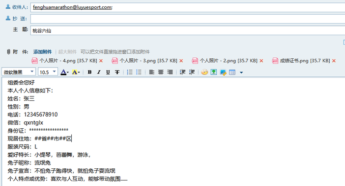 邮件内容:主要为个人信息,包含但不限于姓名,性别,电话,微信,身份证,现居住地、服装尺码,爱好特长,兔子昵称,兔子宣言,个人特点或优势等。