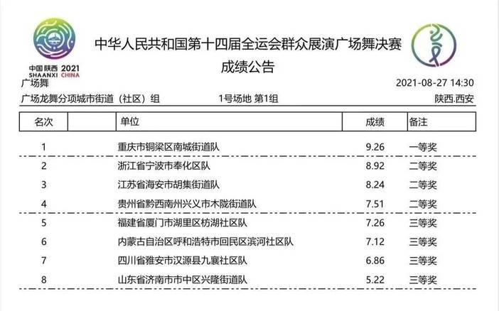 在已经结束全运会群众赛事项目中:奉化区代表队荣获全运会群众展演广场舞项目-广场龙舞城市街道组第二名(二等奖-银牌),奉化区尚田条宅村代表队荣获农村乡镇组第三名(二等奖-银牌),奉化区保安服务有限公司代表队荣获企事业单位组第三名(二等奖-银牌);溪口镇队代表荣获农村乡镇组二十四式简化太极拳三等奖(铜牌)。接下去,锦屏街道代表队将出征第十四届全国运动会气排球男子城市街道社区(中年组)的比赛,希望他们努力拼搏,再传捷报。