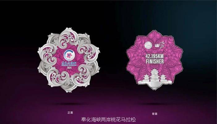 本届赛事的完赛奖牌设计新颖,奖牌外圈由细腻雕琢的纹路形成桃花造型花纹,仿佛春风轻拂,瓣瓣桃花随风起舞,绽放出春天的生机与希望。翻转奖牌,背面同样引人入胜,延续着正面的自然韵律,以粉色为底,将奉化赛道的壮丽与细腻再度铺展;此外,还特别融入奉化地标—弥勒圣坛的元素,让奖牌更加具有辨识度,同时亦赋予了奖牌更深层次的文化内涵。