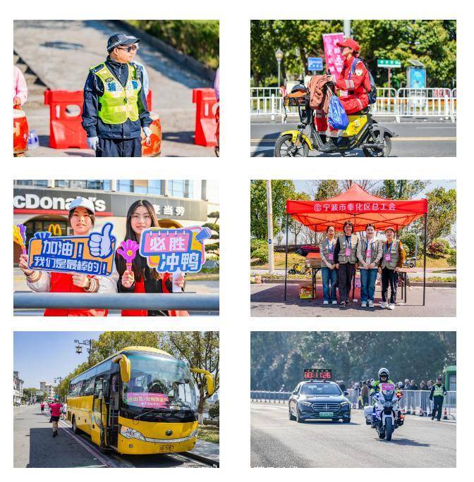 本次赛事宁波市公安局奉化分局共出动公安干警、交警及安保人员近2500人,在赛道沿途设立3家定点医院、3家后备定点医院、28个定点医疗站(其中赛道23个,全马、半马终点3个,欢乐跑终点2个)、救护车23辆、医护人员近500名、70台AED、61名急救跑者、95名医疗急救志愿者、490名赛道医疗观察者共同为赛事安全保驾护航。同时,来自浙江药科职业大学、奉化总工会、宁波城市职业技术学院、奉化区工贸旅游学校、宁波大学及社会招募的2300余各类志愿者遍布竞赛、医疗、会场第一线,各方力量精诚合作、精益求精,共同成就了这场盛大而圆满的奔跑盛会。